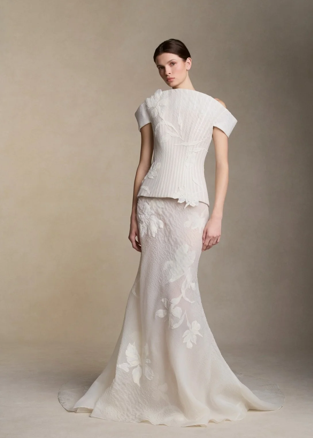 A truly modern gown thrives on sharp silhouettes and striking details. A sleek column or sheath dress with a square neckline creates an architectural elegance, while a dramatic slit or structural accents ensure the look feels bold yet refined. This style is perfect for brides who want something a bit different.